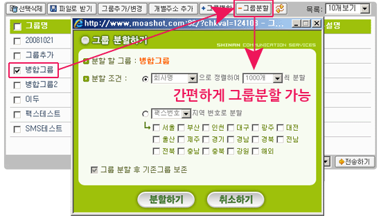 ¢º ÁÖ¼Ò·Ï ºÐÇÒ±â´É: ÁÖ¼Ò·Ï °ü¸®¿¡¼ ºÐÇÒÇÒ ÁÖ¼Ò ±×·ìÀ» ¼±ÅÃÇÏ¿© [±×·ìºÐÇÒ]¹öưÀ» ´·¯ ¼±ÅÃÇÑ ±×·ìÀ» °£ÆíÇÏ°Ô ºÐÇÒ ÇÒ ¼ö ÀÖ½À´Ï´Ù. |