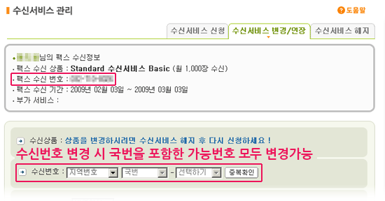 ¢º ¼ö½Å¼ºñ½º º¯°æ: ¼ö½Å¹øÈ£ º¯°æ ½Ã ±¹¹øÀ» Æ÷ÇÔ ÇÏ¿© »ç¿ë °¡´ÉÇÑ ¸ðµç ¹øÈ£·Î º¯°æÀÌ °¡´ÉÇÕ´Ï´Ù. |